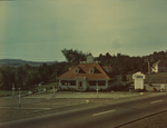 Description :EDIFICE DE BRIQUES DE DEUX ETAGES DONT LES ANGLES SONT ORNES DE BLOCS DE VERRE, QUI SERONT ULTERIEUREMENT REMPLACES PAR DE LA BRIQUE. L'ENSEIGNE EST POSEE PERPENDICULAIREMENT A L'EDIFICE.