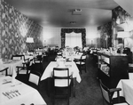 Description :LA SALLE A MANGER COMPREND ENVIRON QUATORZE TABLES AVEC CHAISES ET UN COMPTOIR POUR CAISSE ET CIGARES A LA DROITE. QUELQUES LAMPES DISTRIBUEES AUTOUR DE LA SALLE.