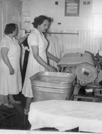 Description :DEUX FEMMES NETTOIENT ET PRESSENT LES UNIFORMES ET NAPPES UTILISES AU RESTAURANT. UNE CUVE RECOIT LE LINGE HUMIDE.
