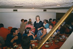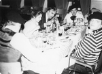 Description :PLUSIEURS PERSONNES, MEMBRES DU CLUB ?, SONT ATTABLEES ET PARTAGENT UN REPAS EN DISCUTANT. ILS SONT DANS UN SOUS-SOL ?. UNE FEMME, AU CENTRE, EST DEBOUT ET SEMBLE S'OCCUPER DU SERVICE.