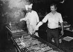 Description :LA SCENE, SE PASSE A L'EXTERIEUR ? DANS UN PARC ?. A DROITE, HABILLE D'UN PANTALON DE COULEUR FONCE ET D'UNE CHEMISE A MANCHES COURTES, RENE LAPIERRE, CUISINIER, S'AFFAIRE A UNE DES GRILLES A STEAK. A SA DROITE, 2 ASSISTANTS CUISINIERS ? BERTR...