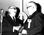 Description :CLAUDE GENEST, A DROITE, RECOIT DES MAINS DE ROLAND DUGRE UN MAILLET SUR LEQUEL UNE PETITE PLAQUE INDIQUE QU'IL VIENT D'ETRE NOMME PRESIDENT. MICRO A GAUCHE. A L'ARRIERE UNE BOUEE DU MONTMORENCY.