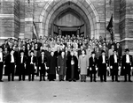 Description :UN GROUPE D'HOMMES EST RASSEMBLE DEVANT LA BASILIQUE SAINT-MICHEL. DEUX DRAPEAUX SONT TENUS PAR DES MEMBRES DES CHEVALIERS DE COLOMB. AU PREMIER RANG, LES DIGNITAIRES. LES OFFICIERS DES CHEVALIERS DE COLOMB SONT VETUS DE TOXEDOS AVEC CAPE ET C...
