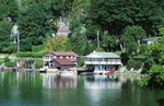 Description :VUE PRISE DU LAC. SUR LA RUE QUELQUES CHALETS BATIS AU-DESSUS DE L'EAU, HANGAR A BATEAUX ET DIVERSES EMBARCATIONS.