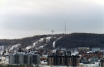Description :LE MONT BELLEVUE ET SA CROIX LUMINEUSE VUS DU PONT JACQUES-CARTIER. ON DISTINGUE A PEINE LES REMONTEES MECANIQUES. AU PREMIER PLAN, LES CONDOMINIUMS DE CONSTRUCTION RECENTE ET LES IMMEUBLES DE BRIQUES ROUGES DU QUARTIER OUEST.