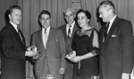 Description :UN HOMME REMET UNE MONTRE A ROBERT GAUTHIER. MME ELIANE GAUTHIER EST ENDIMANCHEE: ROBE VAPOREUSE, BIJOUX, ORCHIDEE A LA MAIN. DE GAUCHE A DROITE: ?, ROBERT GAUTHIER, ARMAND DESBIENS, ELIANE GAUTHIER, ARMAND NADEAU.