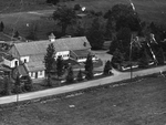 Description :VUE EN PLONGEE DE LA FERME FLETCHER: PETITE MAISON A L'AVANT, EDIFICE AVEC SERRES A L'ARRIERE.