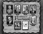 Description :PLAQUE HONORIFIQUE PRESENTANT LES ANCIENS MAIRES, L'HOTEL DE VILLE ET LES ARMOIRIES DE LA MUNICIPALITE DE FLEURIMONT. PREMIERE RANGEE: OVIDE CHAMBERLAND, 1937-1941; THEOPHILE RABY, 1941-1945; J. D. DUPLESSIS, 1945-1947; ARMAND DUPLESSIS, 1947-...