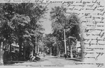 Description :UNE RANGEE D'ARBRES BORDENT LES RESIDENCES. SUR LE TROTTOIR, UNE FEMME CIRCULE ET SUR LA ROUTE DE TERRE, UNE CALECHE.