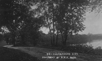 Description :UN CHEMIN DE TERRE LONGE LA RIVIERE ST-FRANCOIS BORDEE D'ARBRES. A DROITE, L'EGLISE ST-JEAN BAPTISTE AU LOIN.