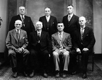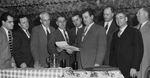 Description :ROBERT GAUTHIER PRESENTE A UNE ASSEMBLEE D'HOMMES UN TEXTE. TOUS SONT TOURNES VERS CE TEXTE. DE GAUCHE A DROITE: 3E: ARMAND DESBIENS; 4E: ROBERT GAUTHIER, SECRETAIRE; 8E ARTHUR MAILLE, MAIRE D'ASCOT NORD; 9E: WILFRID CARON, ECHEVIN.