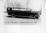 Description :GRAND VEHICULE COUVERT, MUNI DE 6 BANCS CAPITONNES. AU-DESSUS DE LA ROUE ARRIERE, UN OVALE PORTE LA MENTION: ROUTE LA VICTOIRE - GRANBY - VICTORY LANE. AU LOIN, L'ENTREPRISE OVIDO CIGARES. QUELQUES MAISONS A L'ARRIERE-PLAN.