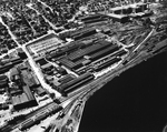 Description :5.1 - VUE A VOL D'OISEAU DE L'USINE. A L'AVANT-PLAN, LE LAC DES NATIONS, PUIS LES RAILS DU C.P. L'USINE EST AU CENTRE. A L'ARRIERE, A DROITE: LA DOMINION TEXTILE. A GAUCHE, LA SHERBROOKE MACHINERIES LIMITED. 5.2 - L'USINE ET SES ENVIRONS V...