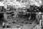 Description :EXCAVATION DU SOL INTERIEUR D'UN BATIMENT POUR CONSOLIDER LE PLANCHER POUR LA RECEPTION D'UNE ENORME MACHINE. GRUE MECANIQUE ET OUVRIERS EN ACTION.