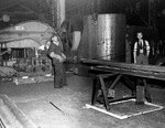 Description :ETAPES D'APLANISSEMENT DE PIECES METALLIQUES. OUVRIERS MANIPULENT DES TIGES OU DES PLANCHES DE METAL. LA TENSION ET LA FATIGUE SE LISENT SUR LEUR VISAGE.