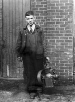 Description :OUVRIER TENANT MOTEUR DANS SA MAIN. IL EST HABILLE D'UNE SALOPETTE DE MECANICIEN.