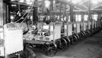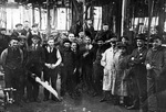 Description :DANS UNE SALLE MUNIE DE NOMBREUSES COURROIES ET DE LAMPES METALLIQUES, 22 HOMMES PRENNENT LA POSE. LA PLUPART DES MACHINISTES PORTENT DES SALOPETTES OU DES SARRAUS ET DES CASQUETTES. LE CONTREMAITRE, 2E A DROITE, EST EN HABIT.