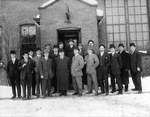 Description :DIRIGEANTS DE LA RAND PRENANT LA PAUSE. ILS PORTENT TOUS UN CHAPEAU, VESTON ET CRAVATE. PHOTO PRISE DEVANT LE BATIMENT NO 15.
