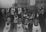 Description :APRES UN MATCH DE HOCKEY, ON RETROUVE DANS LA CHAMBRE DES JOUEURS, LES EQUIPIERS AINSI QUE LES DIRIGEANTS. LUCIEN LACHANCE EST SUR LA 1ERE RANGEE LE 3E A GAUCHE.