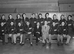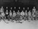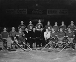 Description :L'ALIGNEMENT DU CLUB (JOUEURS ET DIRIGEANTS) SUR LA GLACE DE LA PATINOIRE. 1ERE RANGEE DE GAUCHE A DROITE: FERNAND CROTEAU (GARDIEN), RAYMOND BRUNEAU (DEFENSE), MOZART ROY (DEFENSE), LUCIEN LACHANCE (ENTRAINEUR), PERCY DONAHUE (DIRECTEUR DES P...