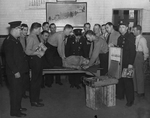 Description :GROUPE DE 15 POMPIERS ET INSTRUCTEURS ASSISTENT A UN COURS DE SECOURISME. DEMONSTRATION DU FONCTIONNEMENT DU RESPIRATEUR. L'EQUIPEMENT EST DEPOSE SUR DES CAISSES DE J.H. BRYANT. DE GAUCHE A DROITE: DIRECTEUR W. PERCY DONAHUE, BENOIT CLAVEL, M...