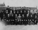 Description :GROUPE DE 14 PERSONNES REUNIES DANS LE BUREAU DE L'ASSOCIATION DES POMPIERS. SUR LE MUR EST ACCROCHE LE CERTIFICAT D'AFFILIATION A L'ASSOCIATION INTERNATIONALE. 1ERE RANGEE ASSIS DE GAUCHE A DROITE: LAURIER FERLAND, ?, THEODORE LAMOUREUX, LEO-...