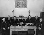 Description :DE GAUCHE A DROITE: LUCIEN LACHANCE, THEODORE LAMOUREUX, ARTHUR MONGEAU, CHARLES DESCOTEAUX (PRESIDENT), EUDORE PROVOST, OSCAR ROY, LEO GIGUERE. SEPT PERSONNES EN UNIFORME ASSISES DANS UN BUREAU. DES REPRESENTANTS DE L'ASSOCIATION DES POMPIERS...