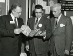 Description :EUGENE GINGRAS (2E A GAUCHE) ET A. PLOURDE (3E A GAUCHE) DE LA NATIONAL WALLPAPER REGARDENT AVEC M R.C. WILLIAMS (1ER DROITE), DE LA DIVISION DES PEINTURES DE LA C.I.L., UN DEPLIANT PRESENTE LORS D'UNE REUNION TENUE A MONTREAL.