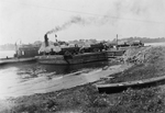 Description :DES CAMIONS CHARGES DE SABLE TRAVERSENT LA RIVIERE OTTAWA A CARILLON. CERTAINS SONT ENCORE SUR LE QUAI.