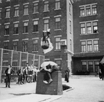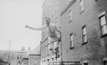 Description :ETUDIANT A GENOUX SUR UNE CORDE. IL TENTE DE PASSER AU TRAVERS D'UN ANNEAU TOUT EN GARDANT SON EQUILIBRE SUR LE FIL. EN ARRIERE-PLAN, LE SEMINAIRE ST-CHARLES-BORROMEE.