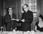 Description :1.1 - HENRI-PAUL LEMIEUX LA MAIN SUR LA BIBLE REPETE SOLENNELLEMENT LA FORMULE D'ASSERMENTATION QUE LUI DICTE LE JUGE CESAIRE GERVAIS A LA TABLE D'HONNEUR DU BANQUET. A DROITE, MME GERVAIS. EN ARRIERE-PLAN, UNE PORTE EN BOIS ET UN MUR TAPISSE....