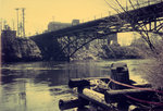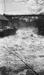 Description :VUE SUR LE PONT WOLFE A LA HAUTEUR DE LA RUE BELVEDERE NORD. A DROITE, LE CENTRALE FRONTENAC. EN ARRIERE-PLAN, LA MAGOG WOOLEN MILLS. AU-DESSOUS DU PONT, LA RIVIERE MAGOG.