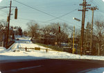 Description :LE PONT WOLFE RECOUVERT DE NEIGE. A CHAQUE EXTREMITE, UNE BARRIERE EMPECHE L'ACCES AU PONT. EN HAUT, DES FEUX DE CIRCULATION. EN ARRIERE-PLAN, LA RUE BELVEDERE NORD, DES MAISONS ET DES AUTOMOBILES.