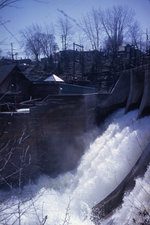 Description :1.1 - LE BARRAGE N.3 SUR LA RIVIERE MAGOG. SES VANNES SONT OUVERTES ET L'EAU TOMBE EN CASCADE. A GAUCHE, LE COIN DE LA CENTRALE FRONTENAC. EN ARRIERE-PLAN, DES MAISONS SUR LA RUE FRONTENAC. 1.2 - GROS PLAN SUR UNE VANNE DU BARRAGE N.3. AU-DESS...