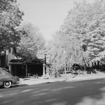 Description :A GAUCHE, LA FACADE EN BOIS D'UNE MAISON DE DEUX ETAGES AVEC A SES COTES UN GARAGE INCENDIE POUR STATIONNER DEUX AUTOMOBILES. DEVANT, L'ARRIERE D'UNE AUTOMOBILE. A DROITE, DES ARBRES AVEC DES PLANCHES DE BOIS SUR LE SOL. A NOTER, LA PRESENCE D...