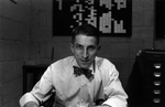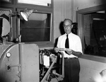 Description :JAMES R. STRICKLAND DANS LA SALLE DE RELIURE. IL TIENT DANS SES MAINS UN DOCUMENT. IL PORTE UNE CHEMISE, UNE CRAVATE ET UNE PAIRE DE LUNETTE. A GAUCHE, UN ENCARTEUSE- PIQUEUSE.