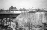 Description :LE PONT WOLFE ENNEIGE. EN-DESSOUS, LA RIVIERE MAGOG. EN ARRIERE-PLAN, DES MAISONS DONT CELLE DE HUBERT-C CABANA (PREMIERE A GAUCHE) PREMIER MAIRE CANADIEN-FRANCAIS DE SHERBROOKE. TOUT AUTOUR, DES ARBRES ET DE LA NEIGE. LA RESIDENCE SANGSTER ES...