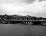 Description :6.1 - LE PONT MONTCALM VU DU SUD SUR LA RIVIERE MAGOG. EN ARRIERE-PLAN, DES ARBRES ET DES BATIMENTS. 6.2 - LE PONT MONTCALM VU DE L'OUEST. A GAUCHE, LA PATON. A DROITE, UN GARAGE ESSO. A COTE, LE BATIMENT DE LA COOPERATIVE AGRICOLE AVEC UNE PA...