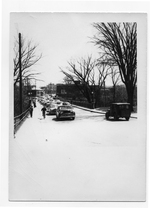 Description :VUE DU PONT WOLFE SUR LEQUEL CIRCULENT PLUSIEURS AUTOMOBILES. IL Y A EGALEMENT DES FEMMES QUI MARCHENT ET UN ENFANT EN BICYCLETTE. AUTOUR, DES ARBRES SANS LEURS FEUILLES. EN ARRIERE-PLAN, LA RUE BELVEDERE NORD, LA VIELLE GARE DU CP A GAUCHE ET...