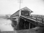 Description :LE PONT AYLMER EN BOIS ET COUVERT, SITUE SUR LA RIVIERE SAINT-FRANCOIS. EN ARRIERE-PLAN A GAUCHE, UNE GROSSE MAISON EN BOIS DE DEUX ETAGES ET DEMI ET UNE AUTRE DE DEUX ETAGES.