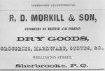 Description :ANNONCE DU COMMERCE DE R.D. MORKILL & SON. ELLE SE LIT COMME SUIT: "R.D. MORKILL & SON, IMPORTERS OF BRITISH AND FOREIGN, DRY GOODS, GROCERIES, HARDWARE, STORES, ETC, WELLINGTON STREET, SHERBROOKE, P.Q.".