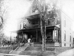Description :RESIDENCE MASSAIVE AVEC FENETRES A VOLETS, ORNEMENTATION EN BOULIER, VASTE GALERIE, BALCON. CHAISES DE PARTERRE EN FONTE. SONT ASSIS SUR LE PERRON: UNE FEMME MINCE TENANT DANS SES BRAS SON FILS.