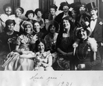 Description :17 PERSONNES DEGUISEES PRENNENT LA POSE. BERNADETTE ARCHAMBAULT GENEST EST A DROITE, A L'AVANT. ALICE CAMPBELL EST A LA GAUCHE DE LA PERSONNE PORTANT UN HAUT-DE-FORME, AU DERNIER RANG. LA 3EME DE GAUCHE SUR CE MEME RANG EST MME MAURICE DE LOTT...