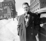 Description :GUY BACHAND, AGE DE 25 ANS, POSE A COTE D'UNE VOITURE DANS UNE RUE DE MONTREAL. QUELQUES BUILDINGS EN ARRIERE-PLAN.