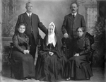 Description :PHOTO DE STUDIO AVEC DECOR EN TROMPE-L'OEIL, AU PREMIER RANG, ASSISES: GEORGINE CAMIRAND-BACHAND, MERE SAINTE-MARIE-ROSALIE, RELIGIEUSE DE LA CONGREGATION DE NOTRE-DAME ET UNE DAME INCONNUE. AU DEUXIEME RANG, DEBOUT: LEONILDE-CHARLES BACHAND E...