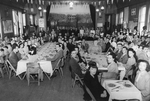Description :QUATRE RANGEES DE TABLE SONT OCCUPEES PAR DES ADULTES ET DES GARCONS (POUR LA TABLE DE GAUCHE), ATTABLES POUR UN REPAS FRUGAL. A L'ARRIERE DE LA SALLE, DEVANT L'ESTRADE, LES INVITES SE TIENNENT DEBOUT. DES JEUNES FILLES ASSURENT LE SERVICE. DE...