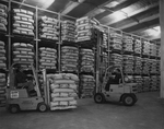 Description :DEUX PREPOSES, HABILLES CHAUDEMENT, TRANPORTENT, A L'AIDE DE LIFTS, DES SACS DE PATATES A L'INTERIEUR D'UN ENTREPOT FRIGORIFIQUE.