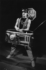 Description :OMER VEILLEUX (YVES DAGENAIS) DANS SON NUMERO "LE ROCHER". IL Y A UNE ENSEIGNE D'ARRET STOP. YVES DAGENAIS TIENT DANS LES MAINS UNE GROSSE RADIO.