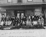Description :UNE FAMILLE NOMBREUSE EST RASSEMBLEE SUR LE PERRON DU MAGASIN GENERAL DE ROBERTSONVILLE. AU CENTRE, UN PRETRE SEPARE LES DEUX PERSONNES FETEES. LES INVITES PORTENT DES RUBANS. LE MAGASIN GENERAL EST EN PLANCHES DE BOIS EMBOUFFETEES. QUELQUES A...