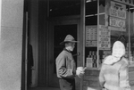 Description :PIERRE ROY, DE LA TROUPE SCOUTE DU SEMINAIRE SAINT-CHARLES-BORROMEE, PROPOSE A UNE PASSANTE UN MACARON. IL EST INSTALLE DANS LE PORTIQUE D'UNE EPICERIE.
